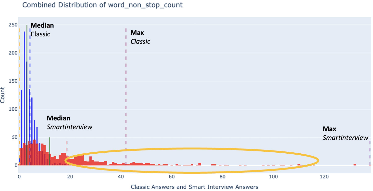 This graphic compares the performance of traditional methodologies with SmartInterview based on word count distribution. The data reveals that, at the median level, SmartInterview captures significantly longer responses, enriching each answer with deeper insights.