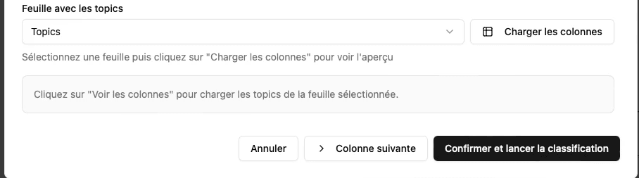 Click "Charger les colonnes" to load and preview the topics from the selected sheet. The system displays how many topics were detected (e.g., "45 topics detectes dans la feuille Topics").