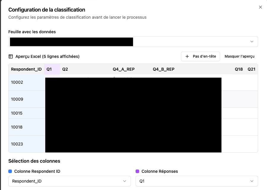 Respondent_ID,user_id,Respondent_Serial)Colonne Reponses (purple indicator) — The column containing open-ended answers to classify (e.g.,