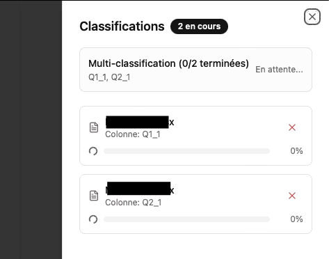 For multi-column classifications, a summary header shows overall batch progress: "Multi-classification (0/2 terminees)".